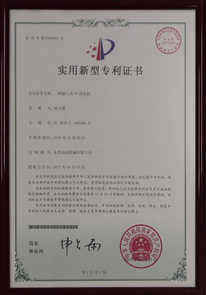 臺式UV固化機專利證書