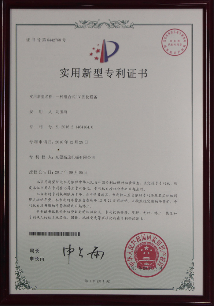 組合式UV固化設(shè)備專(zhuān)利證書(shū)